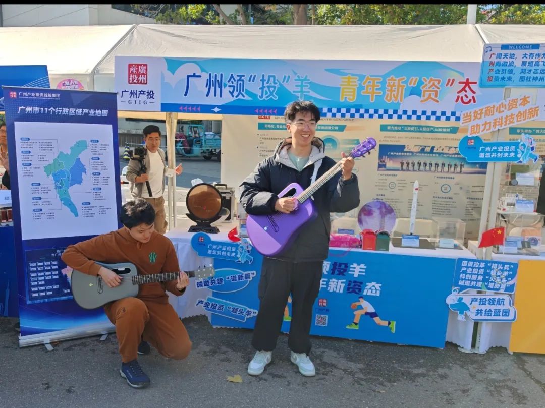 展位现场展示了涵盖广州市11个行政区、4个重点产业方向的25件已投企业展品,吸引了众多学子驻足观看。其中,广州市新材料代表企业——拿火科技研发的碳纤维吉他,更吸引了学生现场演奏一番。